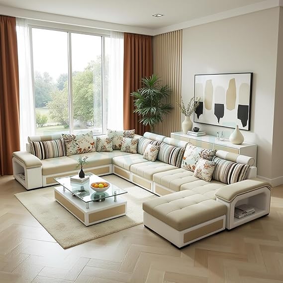 Torque - Silvester Solid Wood 12 Seater Sofa Set for Living Room (Right Side, Beige & White) | Interchangeable U Shape Sectional Sofa with Puffy and Stool for Guest Room