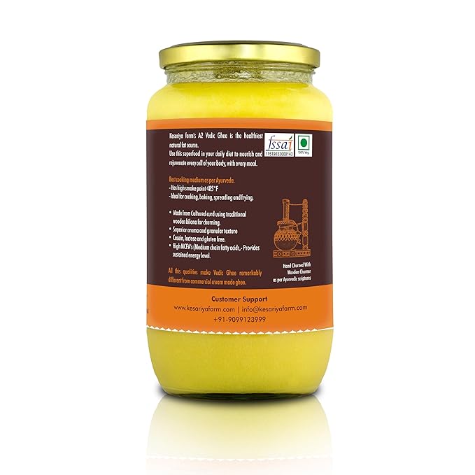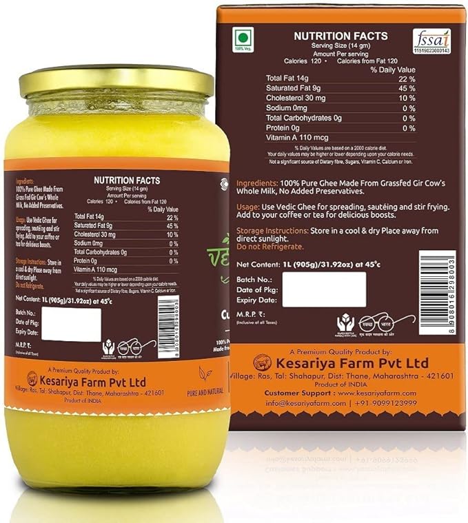 Vedic Ghee Premium A2 Gir Cow Cultured Desi Ghee from Kesariya Farm | Vedic Bilona Two Way Churned | Indian Gir Cow Ghee, Pure A2 Ghee, Natural & Healthy, Non-GMO | Lab Certified (1L)