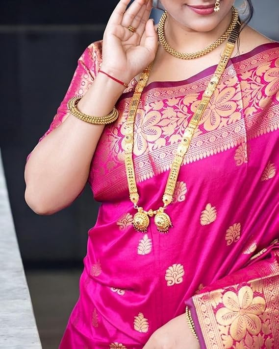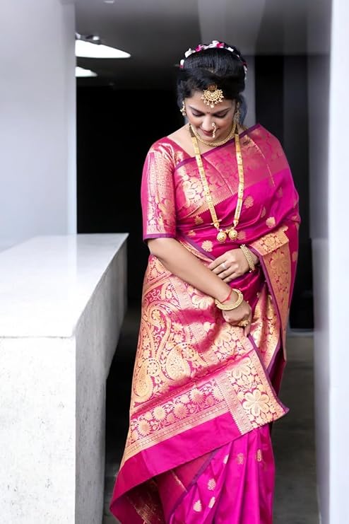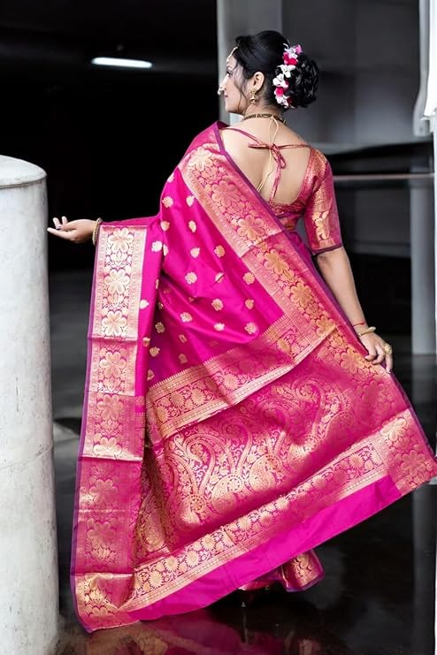 • Traditional Banarasi Weaving: Features exquisite jacquard zari patterns for a regal look