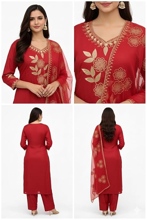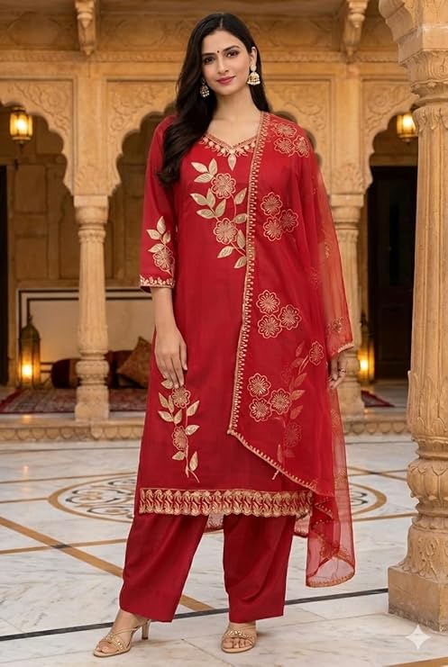• ELEGANT FLORAL EMBROIDERY: Rich red kurta set featuring detailed floral embroidery inspired by traditional Indian craftsmanship, suitable for special occasions and celebrations